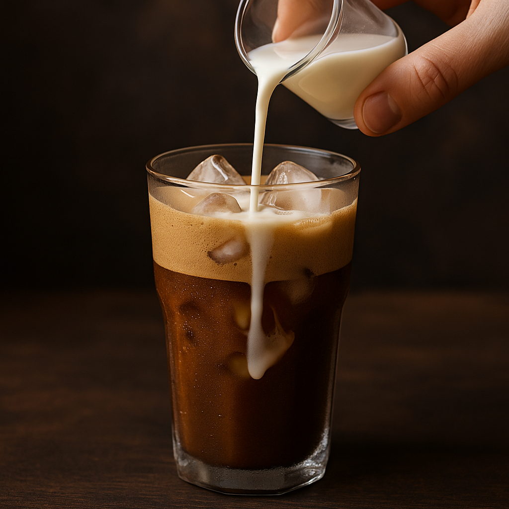 In the cup, pour the milk over the frothed coffee. The foam should remain at the top.